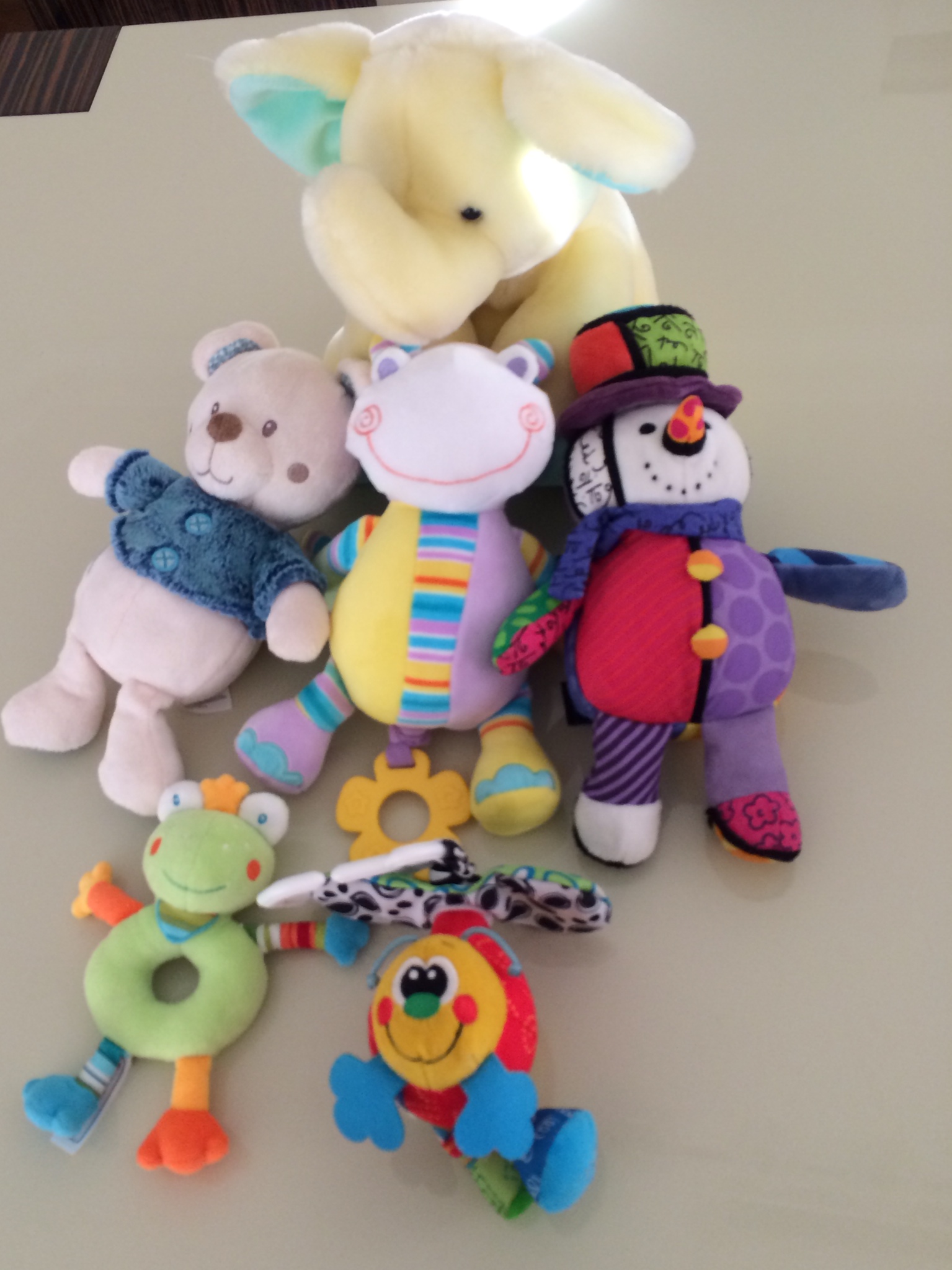 Pelüş oyuncaklar Tuna için birer arkadaş, hepsinin kendine özgü komik isimleri var. Ağzımıza alıp yere atmaktan çok hoşlandığımız Kurbağa Prens, gece uyurken sen hala uyumadın mı bakayım diye aşağı yukarı salladığımız ayımız Tontiş, yatağımızda boş alanlarımızı dolduran Sarı Filcik, uyandığımızda çekiştirdiğimiz ve kanatlarını çırpan Vız Vız Arımız, dişlerimizi kaşımak için kullanmayı sevdiğimiz, yanaklarından kırımızı ışık saçan müzikli Hipo (hipopotam) ve son olarak aldığımız karnına bastırdığımızda müzik çalan Havuç Burun.